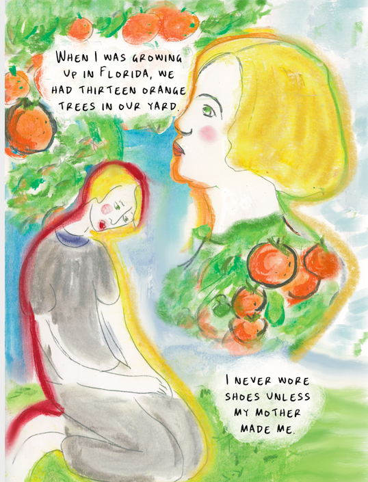 In the first chapter, “Oranges,” we learn of Kercheval’s early years in Florida, a sunny place where thirteen orange trees grow in her family’s yard. Her existence is carefree, spent mostly outdoors. She “never wore shoes unless [her] mother made her.” And then she breaks her back, is forced to wear a brace, and is seldom allowed outside. As her parents worry, Kercheval’s own world grows darker and smaller. She is only allowed to remove her brace to swim, but the ocean is too rough, so she is confined to a neighbor’s pool. Thus, Kercheval prepares us for themes of bodily fragility and the physical dangers that threaten the human form. This includes an entire chapter near the end called “Fallen,” which is populated by depictions of falling bodies: her father, her mother, and herself, over and over.